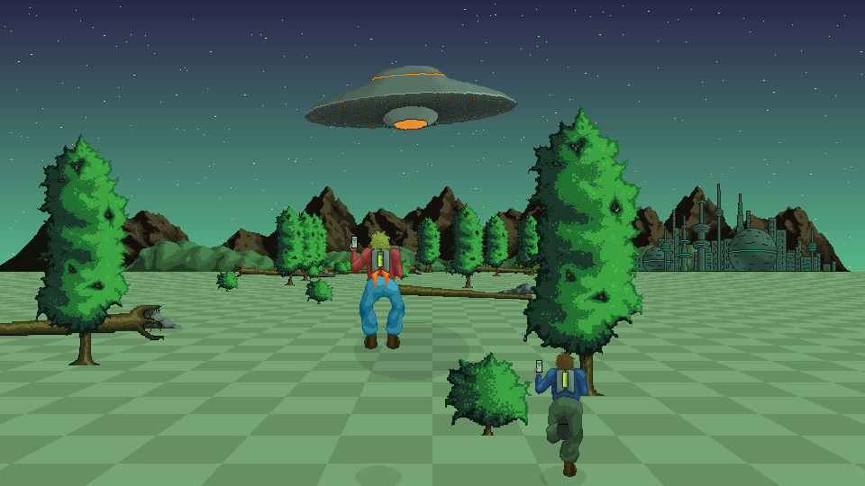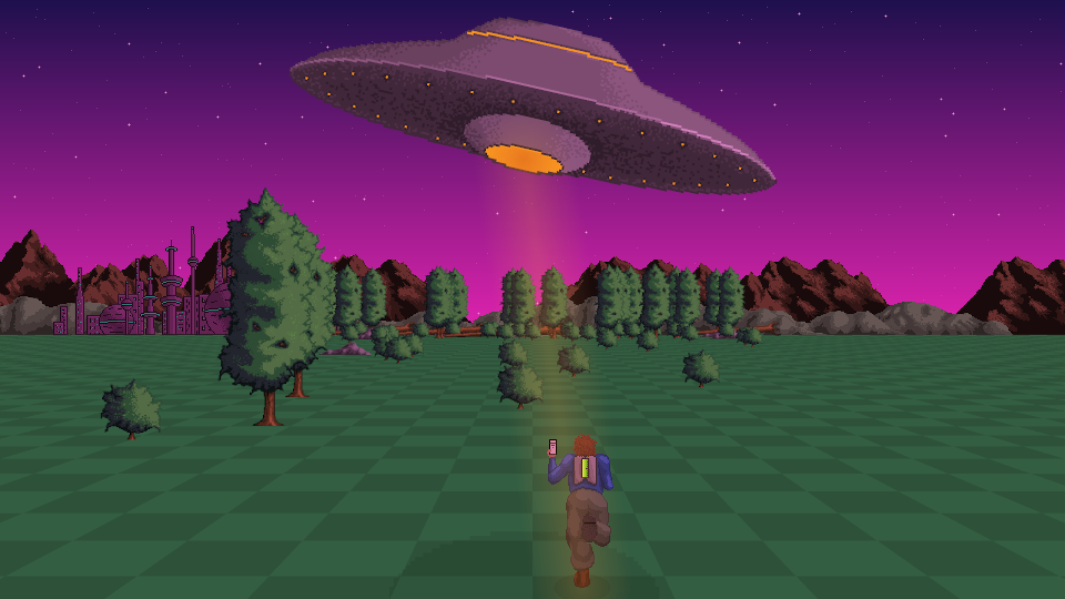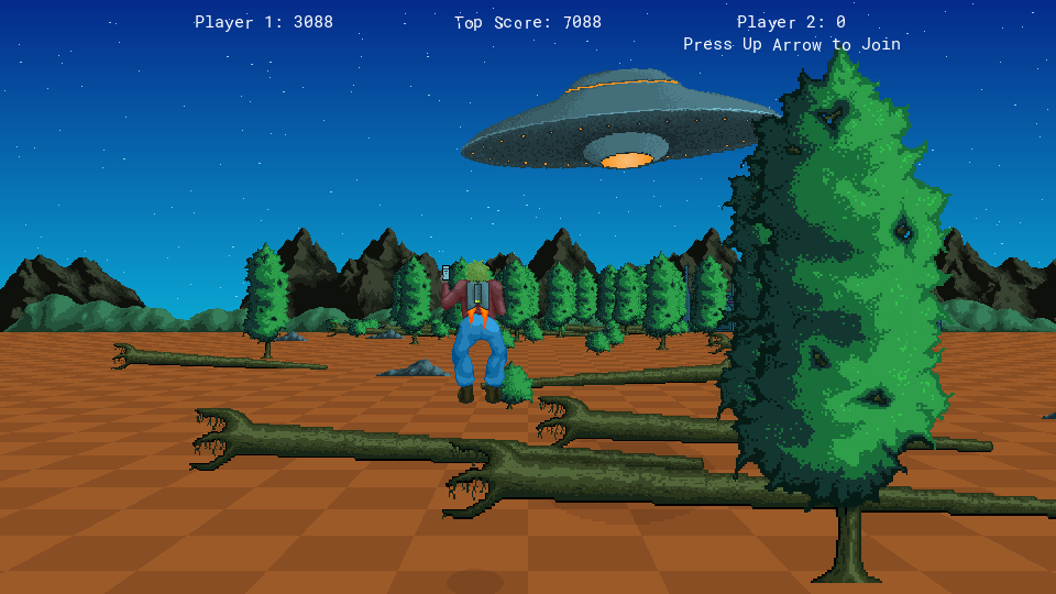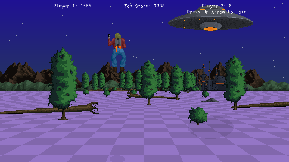 Aliens have stolen the WIFI. Use your jetpack and chase the spaceship to keep your signal. Avoid hazards as you run through the wilderness. Dodge the UFO attacks as it tries to shake you off its trail. Gain Points for staying alive, avoiding obstacles, and avoiding the UFO tractor beam.
